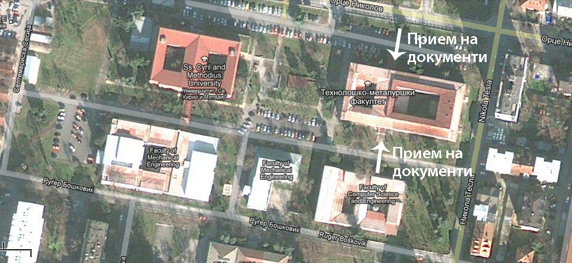 Прием на документи ќе се врши во кабинетот 117. На сликата подолу прикажана е мапа на влезовите во зградата каде што ќе се вршат уписите. Сликата во поголема резолуција можете да ја најдете на овој линк[PNG].